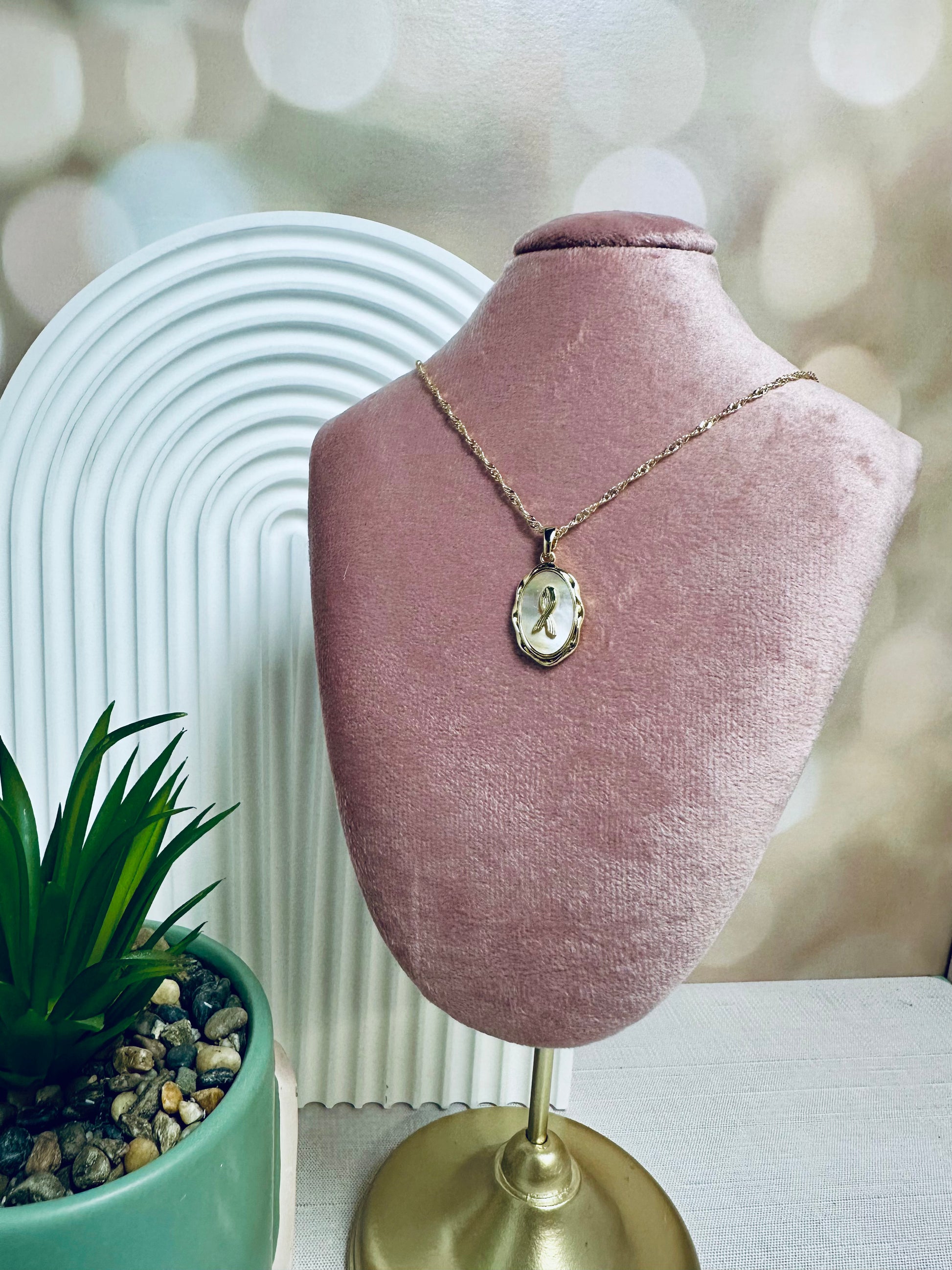 Gold filled necklace with oval mother of pearl cancer ribbon charm