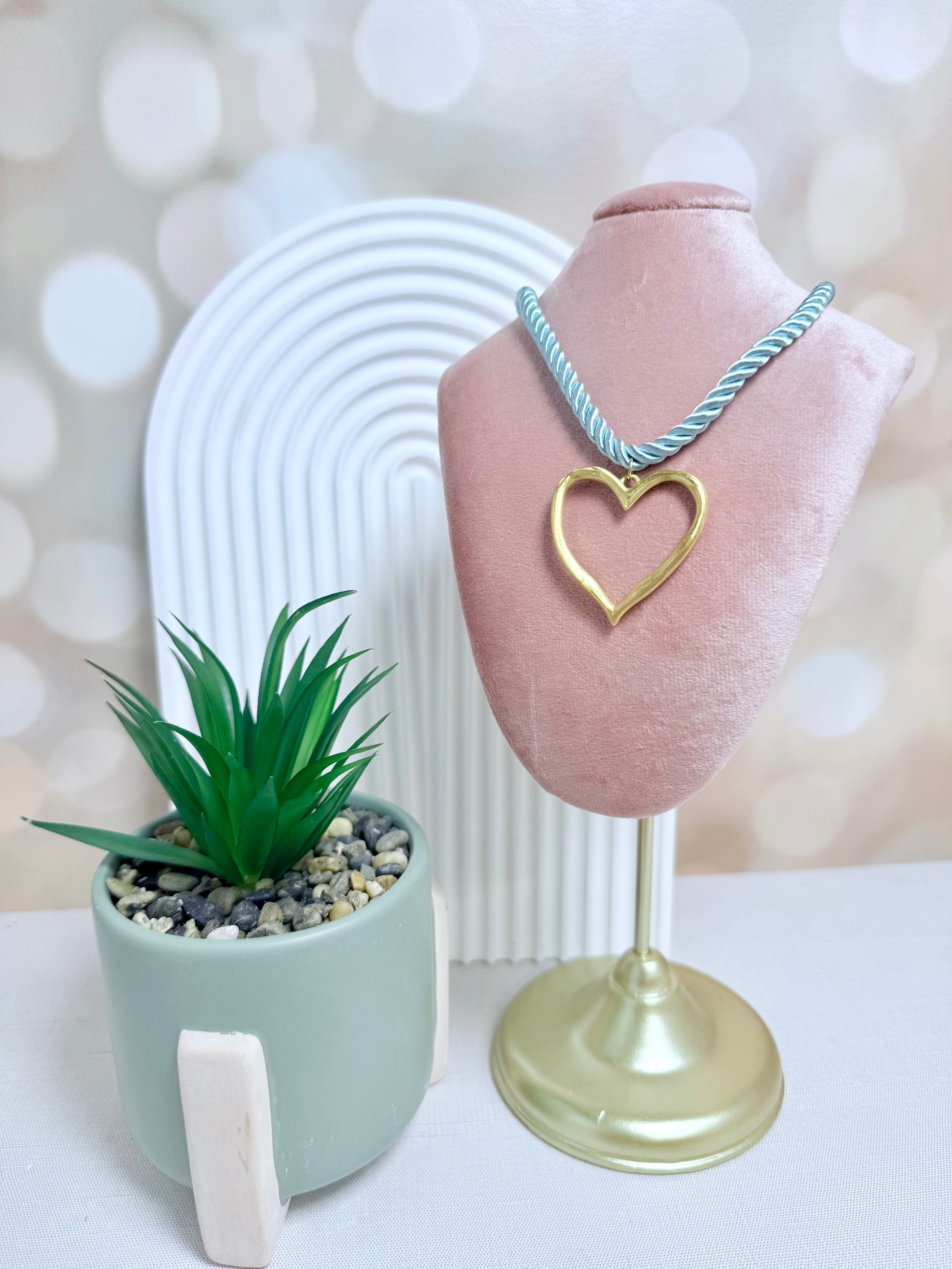 Light blue/aqua rope necklace with hollow gold heart charm